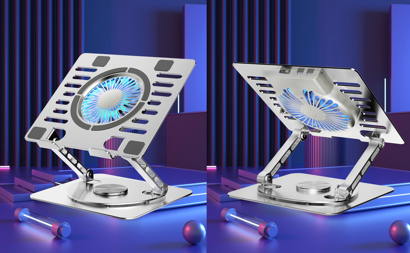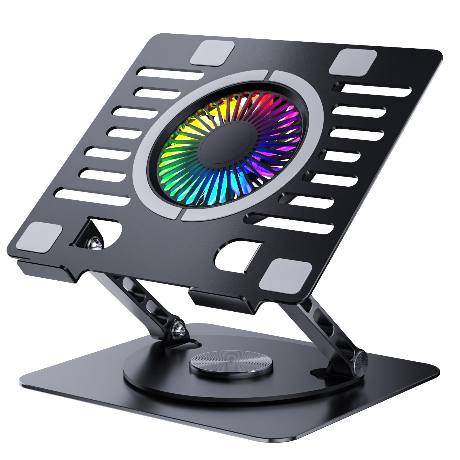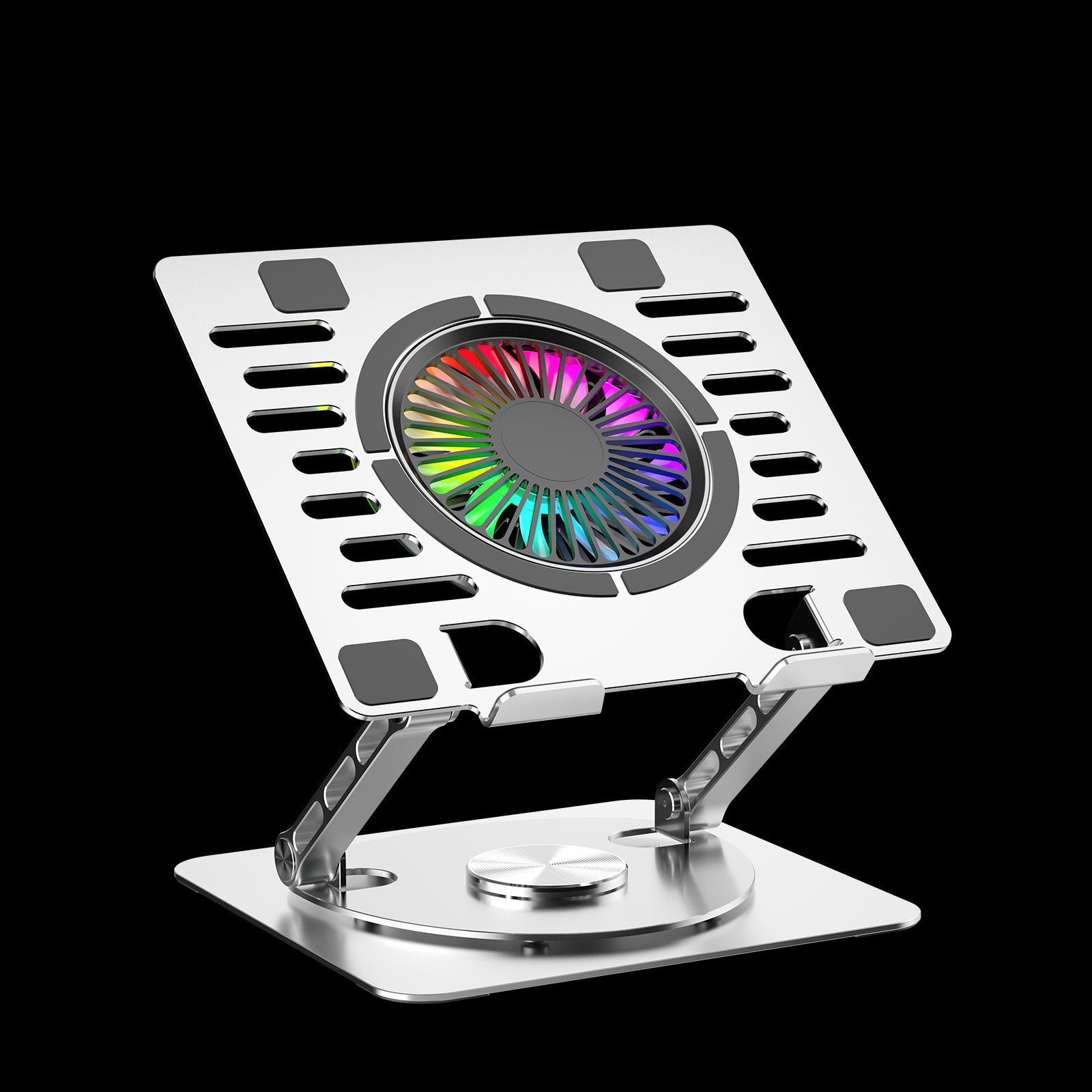 COOL 10 RGB LIGHTS – Foldable Detachable light weight laptop cooling pad aluminum alloy silver gray holder folding laptop stand helps keep laptops running cooler. Hollow design and adjustable height increase airflow. Aluminum platform draws heat away from laptop.