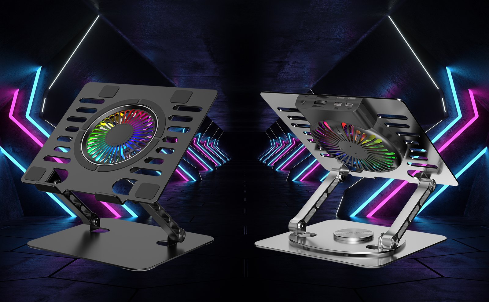 COOL 10 RGB LIGHTS – Foldable Detachable light weight laptop cooling pad aluminum alloy silver gray holder folding laptop stand helps keep laptops running cooler. Hollow design and adjustable height increase airflow. Aluminum platform draws heat away from laptop.